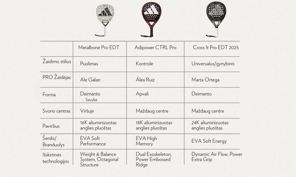 „adidas“ nuolat stebina naujovėmis, o šiuo metu prekyboje pasirodė trys išskirtiniai, profesionalams skirti modeliai: „Metalbone Pro EDT“, „Adipower CTRL Pro EDT 3.4“ ir „Cross It Pro EDT 2025“. Šios raketės ne tik išsiskiria prabangia išvaizda, bet ir yra aprūpintos pažangiausiomis technologijomis, skirtomis patyrusiems ir profesionaliems žaidėjams. Panagrinėkime kiekvieną iš jų ir palyginkime, kuo jos skiriasi.