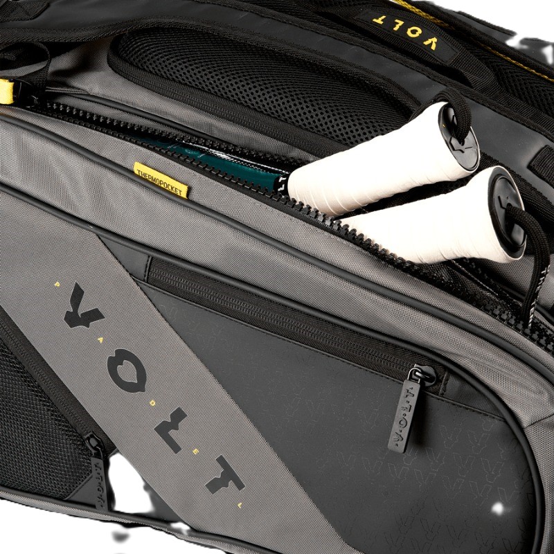The gray “Volt” XL padel bag has a large main compartment and two side compartments, one of which with thermal insulation, in which you can safely and comfortably carry 2 rackets on each side (4 in total).